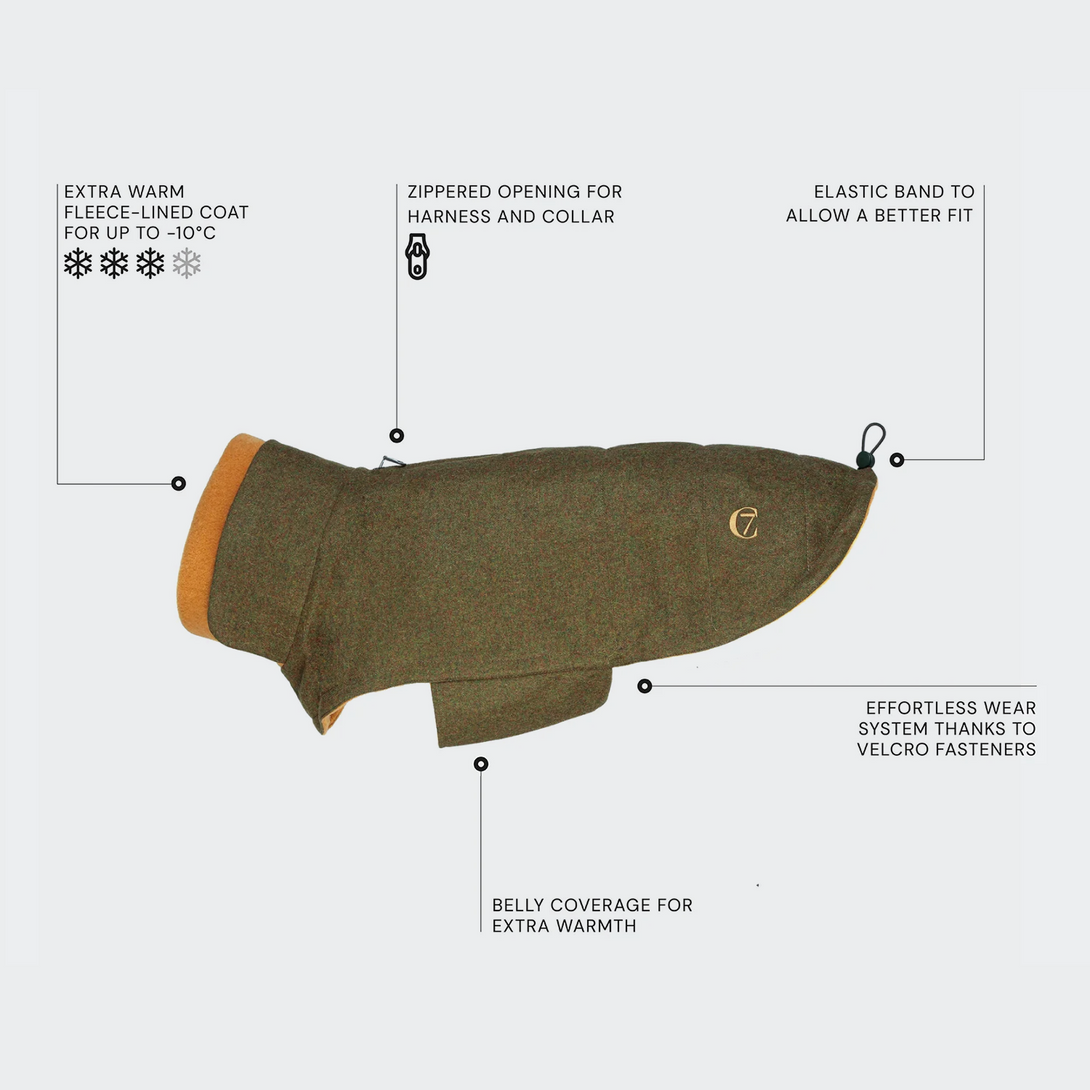 Frosty pavement, little ear-flicks, tail still keen. Slip on this fleece-lined winter coat to warm the chest and belly while the wool-mix outer shrugs off drizzle and wind. The waistband closes quickly with Velcro, the rear elastic helps the coat stay put as they trot and turn, and a zipped opening on top gives easy access to a harness. Cut for natural movement, it’s a solid pick for dogs with little undercoat, youngsters, seniors and city walkers. Autumn Green is a limited edition colour, and the coat is machine-washable for straightforward care.