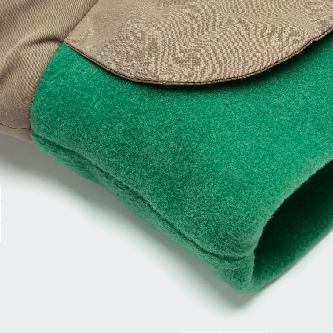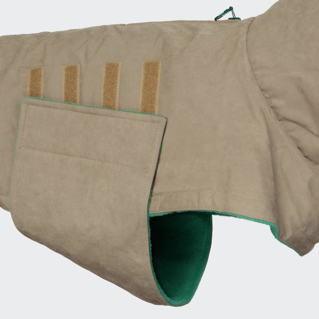 - Materials: Outer shell waxed cotton blend; Lining polyester fleece; Trims elastic/Velcro; Zip harness opening.